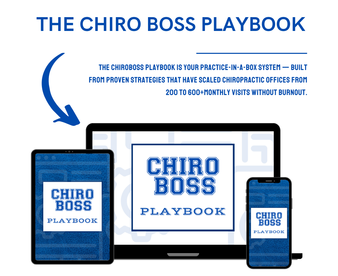 The ChiroBoss Playbook is your practice-in-a-box system for growing from 200 to 600+ monthly visits with confidence. Inside are the proven frameworks for patient care, daily operations, billing, staffing, and marketing — all designed to streamline your practice and scale without burnout. Boss Plan and Jr Boss Plan members get the Playbook at a discounted rate, and full access is available to non-members for $1500.